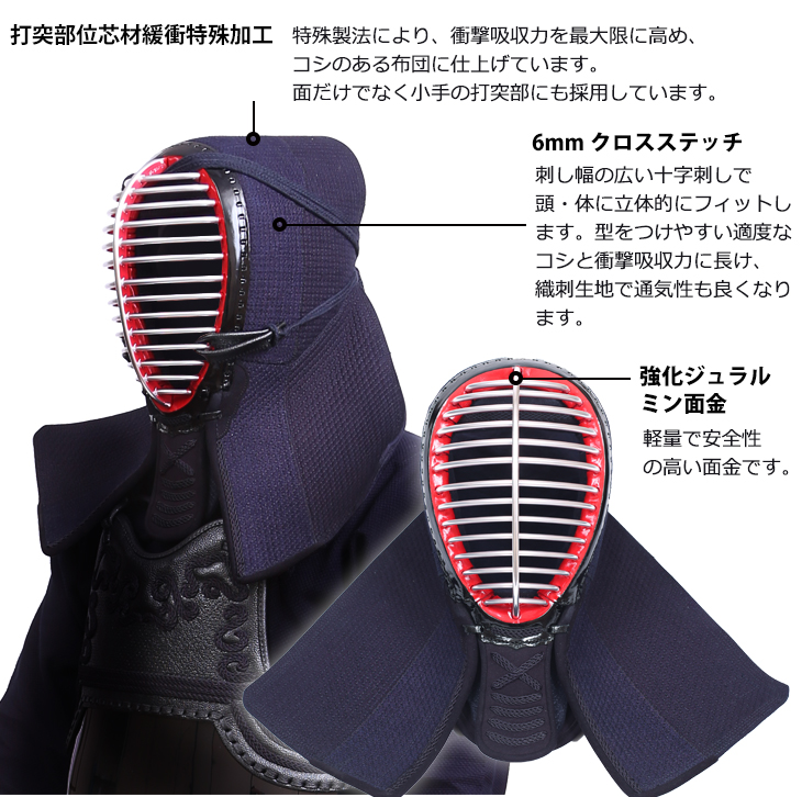 面:強化ジュラルミン、打突部位芯材緩衝特殊加工、内輪抗菌素材、ISG標準装備、クロスステッチ、四段飾