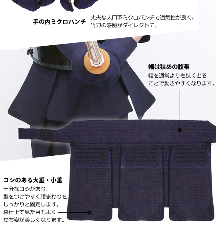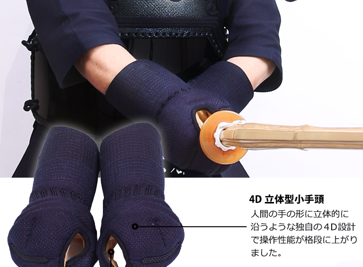 小手:ミクロパンチ加工、甲手頭4D立体型、クロスステッチ、総織刺仕立、打突部位芯材緩衝特殊加工